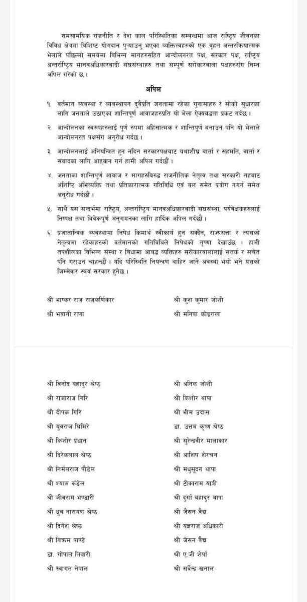 प्रजातान्त्रिक व्यवस्थामा निषेध स्वीकार्य नहुने भन्दै उद्योगा वाणिज्य महासंघकी पूर्व अध्यक्ष भवानी राणा, कुशकुमार जोशी, भाष्कर राजकर्णिकार, कलाकार, दिपकराज गिरी, मनिषा कोइराला, टिकाराम यात्री, युवराज घिमिरे, जीवरामभण्डारी, स्वागत नेपाल, सर्वेन्द्र खनालसहित ३२ जनाले ६ बुँदे अपिल जारी गरेका हुन् ।