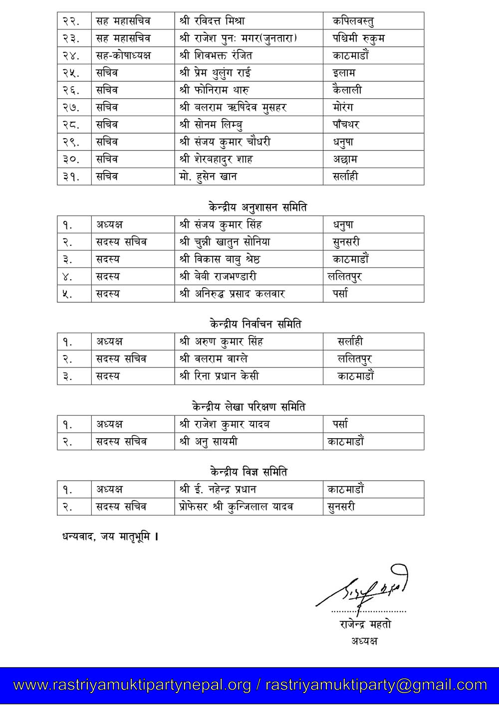 काठमाडौं । राजेन्द्र महतो नेतृत्वको राष्ट्रिय मुक्ति पार्टी नेपालले केन्द्रीय कार्यसमितिका पदाधिकारीहरूको चयन गरेको छ ।