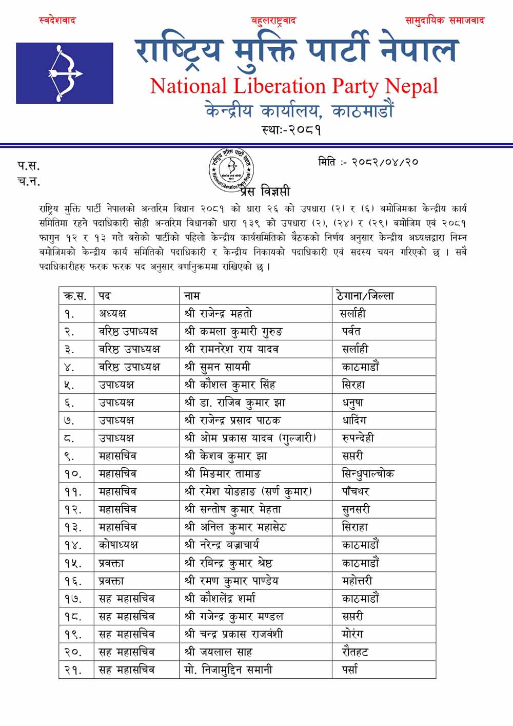 मंगलबार बसेको बैठकले पदाधिकारी चयन गरेको हो । पार्टीको अन्तरिम विद्यान बमोजिम केन्द्रीय अध्यक्षले केन्दीय कार्यसमितिको पदाधिकारी र केन्द्रीय निकायको पदाधिकारी एवं सदस्य चयन गरेको राष्ट्रिय मुक्ति पार्टी नेपालले जानकारी दिएको छ ।