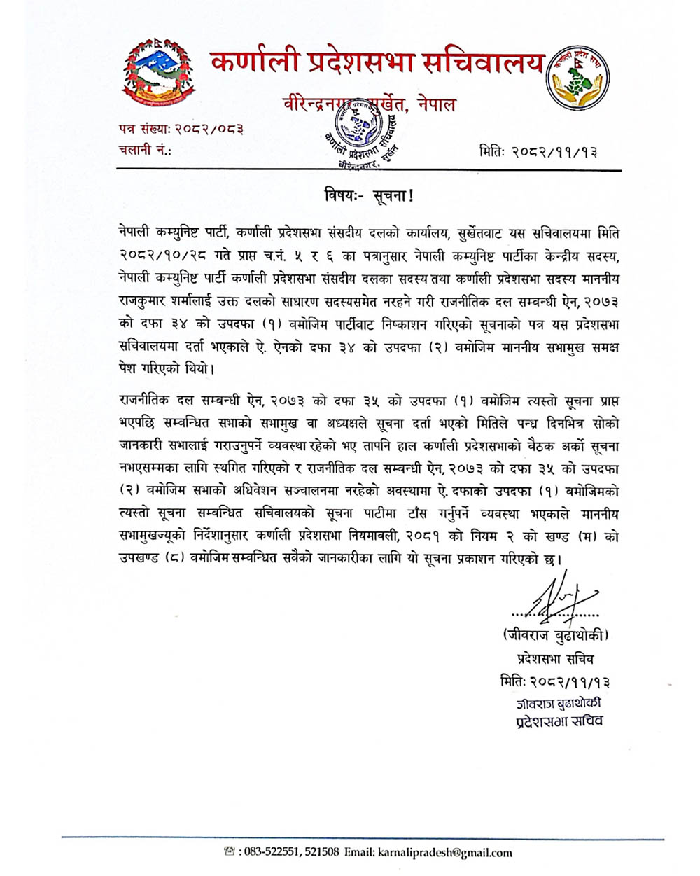 सभामुखको निर्देशनअनुसार कर्णाली प्रदेशसभा नियमावली, २०८१ को नियम २ को खण्ड (म) को उपखण्ड (८) बमोजिम सबैको जानकारीका लागि सूचना प्रकाशित गरिएको प्रदेशसभा सचिव जीवराज बुढाथोकीले जनाएका छन् ।