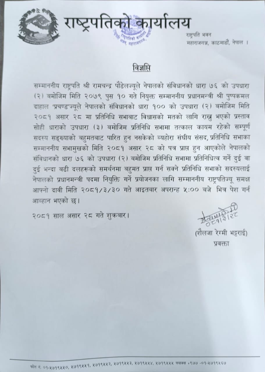 राष्ट्रपति पौडेलले असार ३० गते आइतबार बेलुका ५ बजेसम्म प्रधानमन्त्रीको दाबी गर्न दुई वा दुई भन्दा बढी दलको समर्थनमा बहुमत प्राप्त गर्नसक्ने प्रतिनिधि सभा सदस्यलाई प्रधानमन्त्रीको दाबी पेस गर्न भनेका हुन् ।