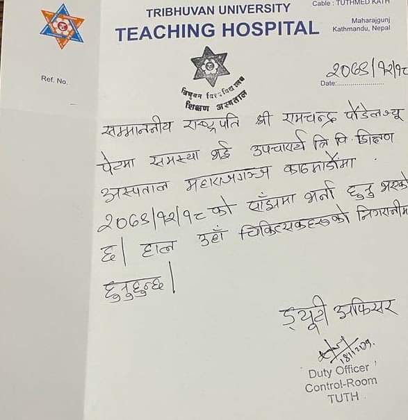 हाल चिकित्सकको निगरानीमा उपचार भइरहेको अस्पतालले जनाएको छ । राष्ट्रपतिका पौडेलको पेटमा समस्या देखिएएको अस्पतालले जानकारी गराएको छ ।