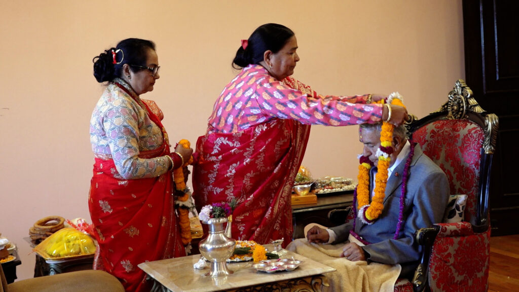 काठमाडौं । राष्ट्रपति रामचन्द्र पौडेलले बहिनीहरू शारदा पण्डित र चन्दा ओझाको हातबाट तिहारको टीका ग्रहण गरेका छन् ।