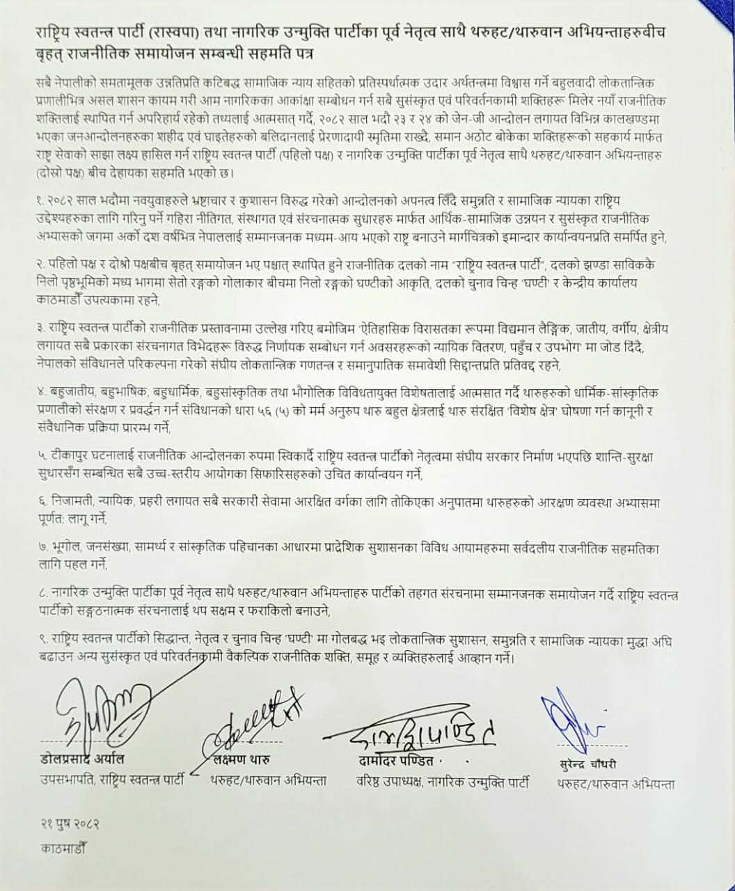 काठमाडौँ । राष्ट्रिय स्वतन्त्र पार्टी (रास्वपा) र नागरिक उन्मुक्ति पार्टीका पूर्व पदाधिकारीका साथै थरुहट/थारुवान अभियन्ताहरूबिच समायोजन भएको छ ।