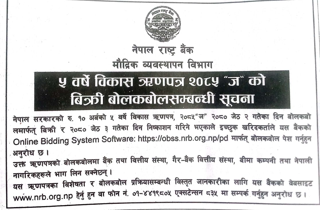 बैंकको सूचना अनुसार जेठ २ गते देखि अनलाइन दरखास्त दिन सक्नेछन् । विकास ऋणपत्रको निष्काशन भने जेठ ३ गते हुनेछ ।