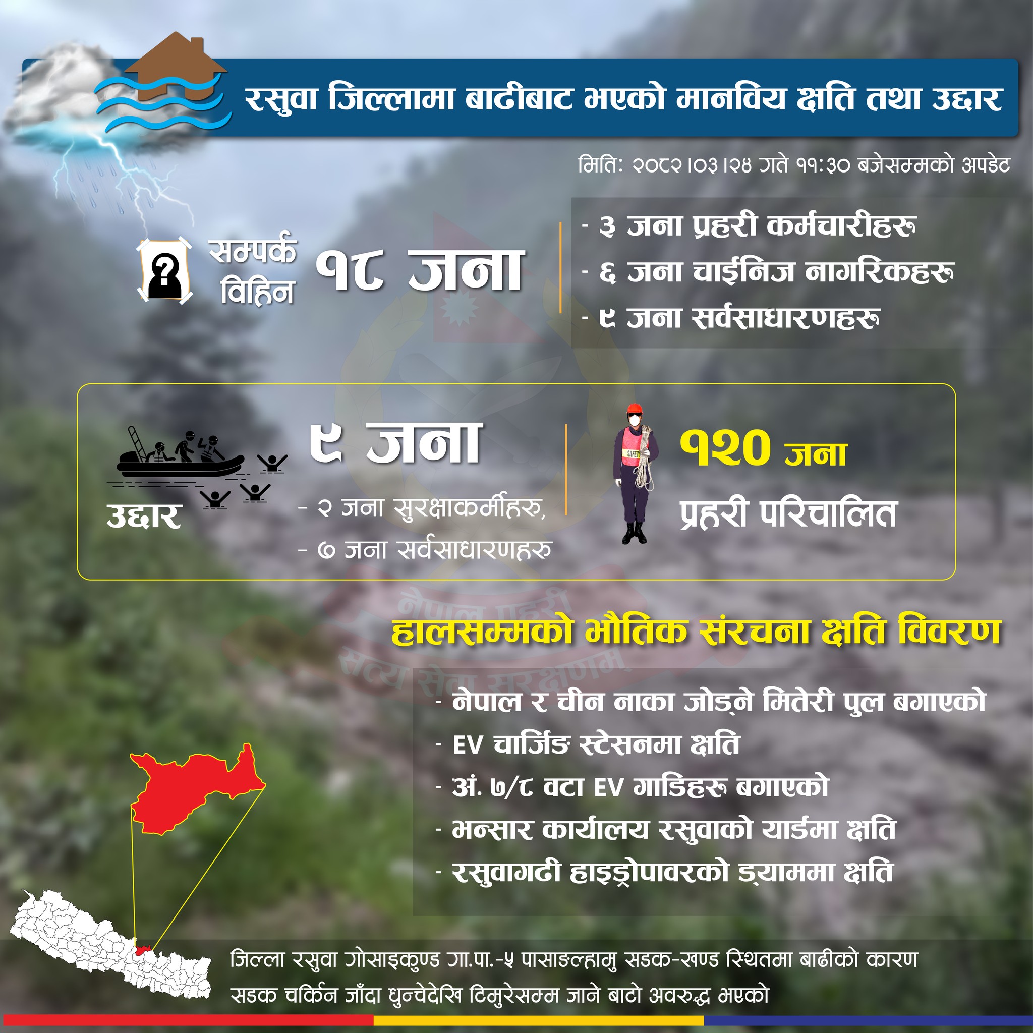 यस्तै, उद्धार गरिएकामा दुई जना सुरक्षाकर्मी र ७ जना सर्वसाधारण छन् । थप मानवीय क्षति हुन नदिने कुल १२० जना प्रहरी परिचालन गरिएको बताइएको छ ।