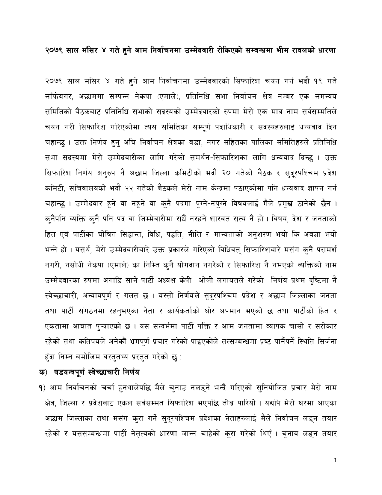 टिकट नपाएपछि पहिलाेपटक पत्रकार सम्मेलन गर्दै रावलले ओलीकाे खराे आलाेचना गरेका छन् । उनले ओलीले गरेका असंवैधानिक कामकाे आफुले विरोध गरेका कारण ओलीले टिकट नदिएको बताए ।