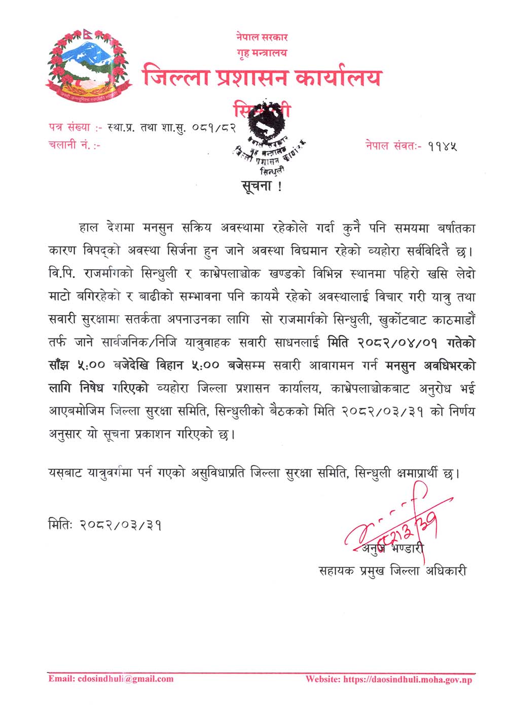 हाल मनसुन सक्रिय रहेकाले सम्भावित विपद्जन्य घटना हुन सक्ने भन्दै जोखिम न्यूनीकरणका लागि उल्लेखित क्षेत्रमा एक महिनाका लागि यातायात सञ्चालनमा रोक लगाइएको जनाइएको छ ।
