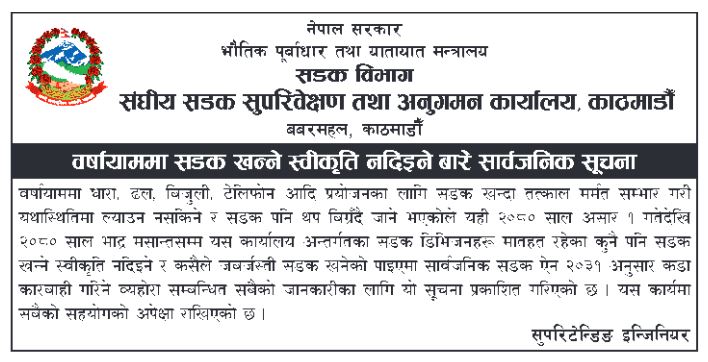 ‘वर्षायाममा धारा, ढल, बिजुली, टेलिफोन आदि प्रयोजनका लागि सडक खन्दा तत्काल मर्मत–सम्भार गरी यथास्थितिमा ल्याउन नसकिने र सडक पनि थप बिग्रँदै जाने भएकोले यही २०६० साल असार १ गतेदेखि २०८० साल भाद्र मसान्तसम्म यस कार्यालयअन्तर्गतका सडक डिभिजनहरू मातहत रहेका कुनै पनि सडक खन्ने स्वीकृति नदिइने र कसैले जबर्जस्ती सडक खनेको पाइएमा सार्वजनिक सडक ऐन २०३१ अनुसार कडा कारबाही गरिने बेहोरा सम्बन्धित सबैको जानकारीका लागि यो सूचना प्रकाशित गरिएको छ’, सूचनामा भनिएको छ।