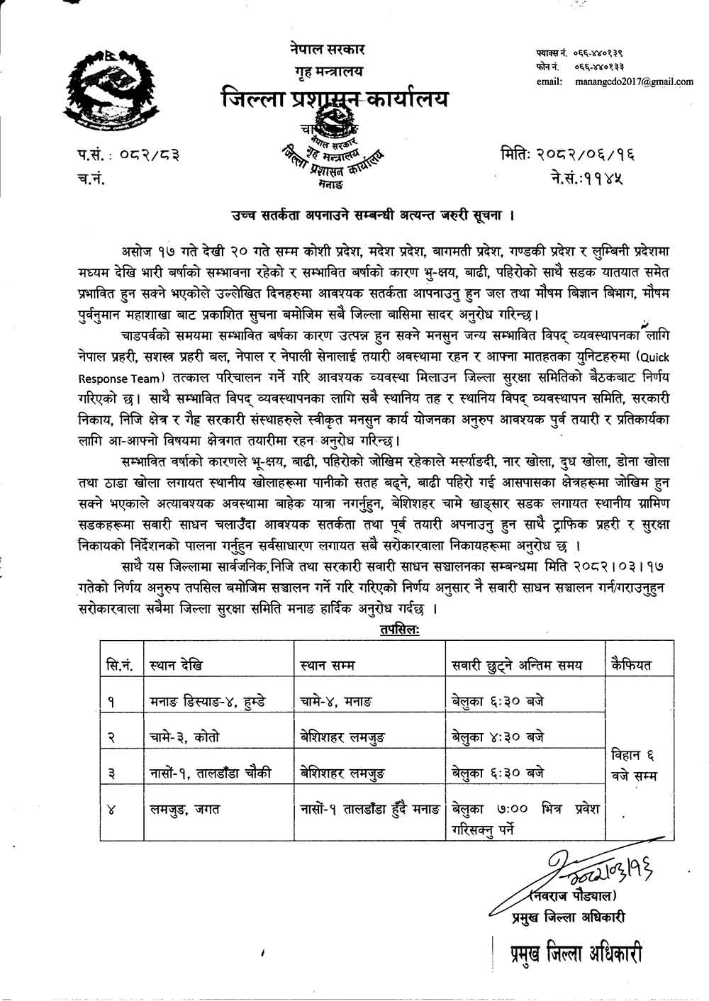 क्षेत्रमा जोखिम हुनसक्ने भएकाले अत्यावश्यक अवस्थामा बाहेक यात्रा नगर्न, बेंसीसहर–चामे–खाङ्सार सडकलगायत स्थानीय ग्रामीण सडकमा सवारीसाधन चलाउँदा आवश्यक सतर्कता तथा पूर्व तयारी