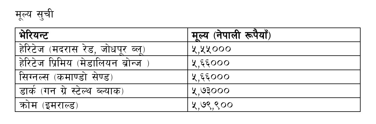 हेरिटेज प्रिमियम : यो भेरियन्ट मेडालियन ब्रोन्जमा उपलब्ध छ । यसले क्लासिकको वास्तविक स्वरूपलाई थप समृद्ध बनाएको छ ।
