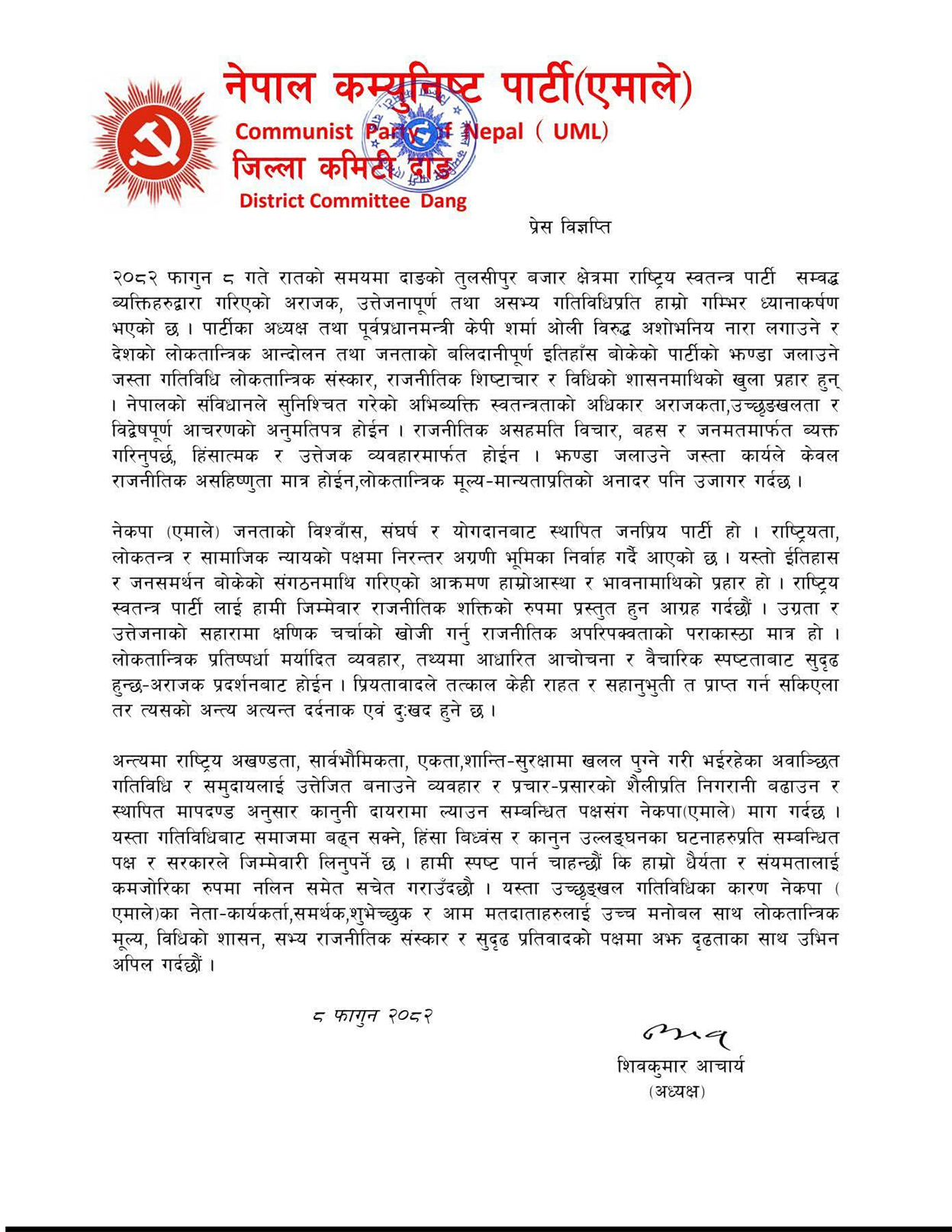 गएराति तुलसीपुर बजार क्षेत्रमा रास्वपा सम्बद्ध व्यक्तिहरूले एमाले अध्यक्ष एवं पूर्वप्रधानमन्त्री केपी शर्मा ओलीविरुद्ध अशोभनीय नारा लगाउनुका साथै पार्टीको झण्डा जलाएको भन्दै एमाले जिल्ला कमिटीले शुक्रबार एक विज्ञप्तिमार्फत भत्र्सना गरेको हो।