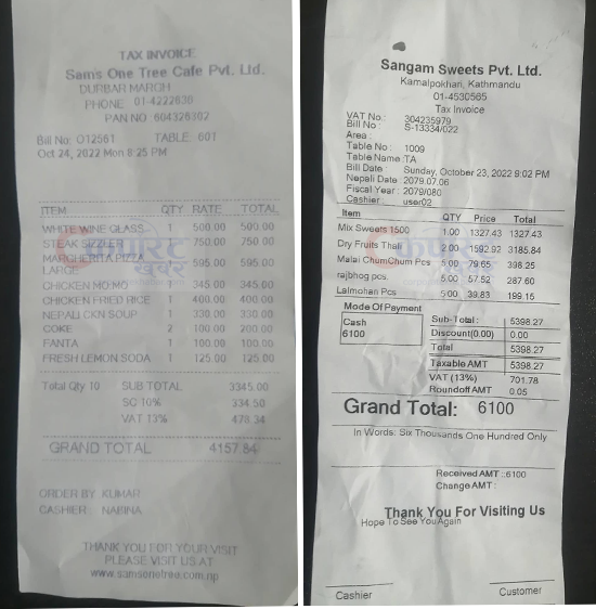 त्यसै गरी सोमबार सेम्स ओन ट्री क्याफेले पनि एक्सट्रा भ्याट र सर्भिस शुल्क जोडेर ३ हजार ३४५ रुपैयाँको बिललाई ४ हजार १५७ रुपैयाँको बनाएको थियो ।