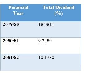 इन्स्योरेन्सले हालसम्म कुल ३७.८०८ प्रतिशत लाभांश वितरण गरेको जनाएको छ । इन्स्योरेन्सले आर्थिक वर्ष २०७९/८० मा १८.३८११ प्रतिशत बोनस सेयरवितरण गरेको थियो भने आव २०८०/८१ मा ८ प्रतिशत बोनस र१.२४८९ प्रतिशत नगद लाभांस गरि कुल ९.२४८९ प्रतिशत लाभांसवितरण गरेको थियो । गत आर्थिक वर्ष २०८१/८२ मा मात्रै १०.१७८० प्रतिशत लाभांस वितरण गरेको पनि इन्स्योरेन्सले जनाएको छ ।