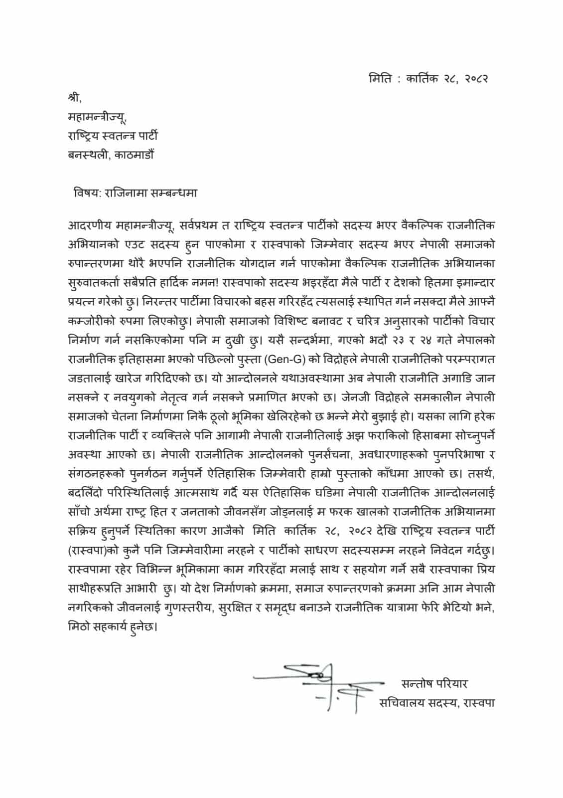 काठमाडौं । राष्ट्रिय स्वतन्त्र पार्टी (रास्वपा)का सचिवालय सदस्य सन्तोष परियारले पार्टीको साधारण सदस्यसमेत नरहने गरी राजीनामा दिएका छन् ।