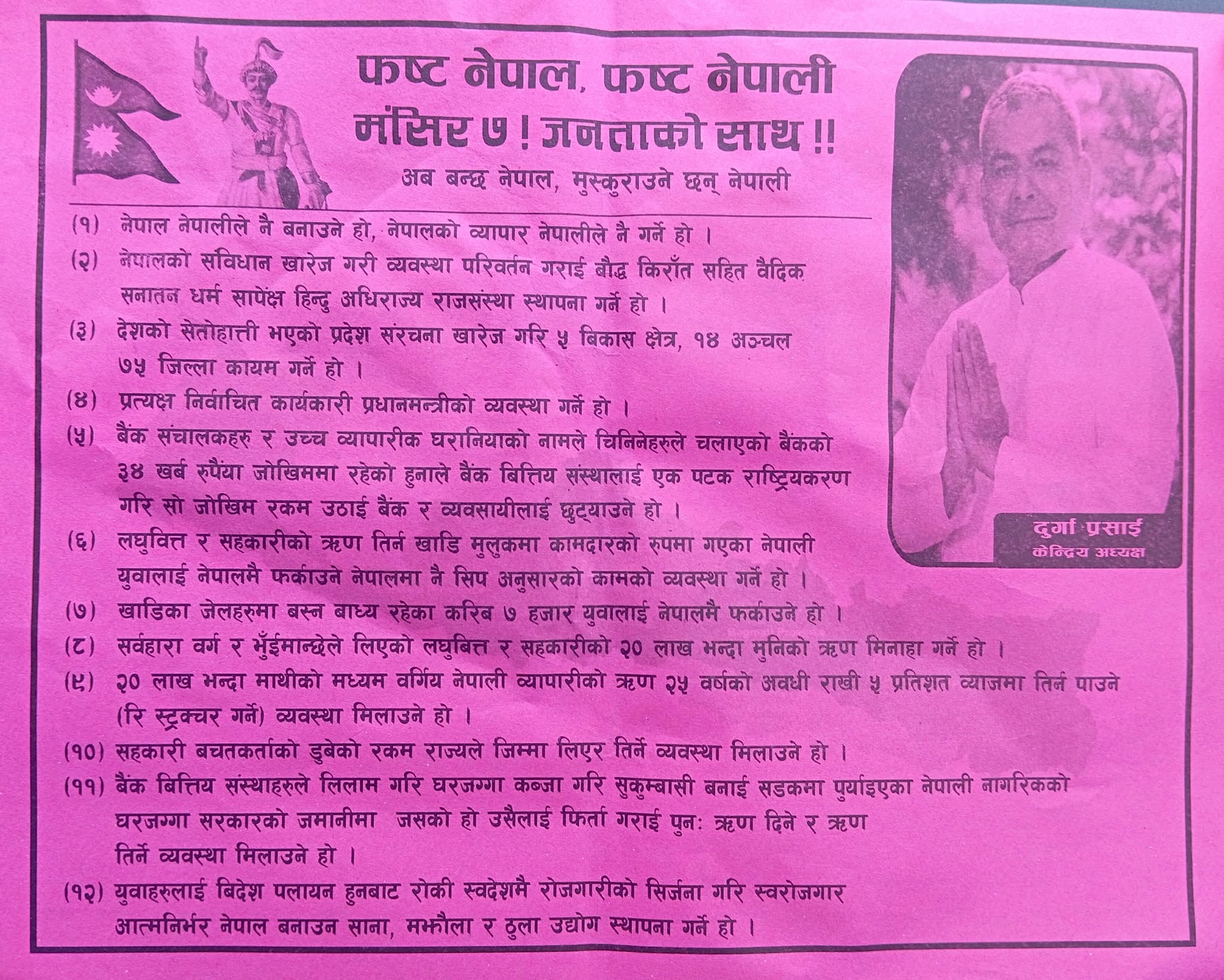 काठमाडौं । दुर्गा प्रसाईँले सरकारसँग २६ बुँदे माग पेस गरेका छन् । बुधबार गृह मन्त्रालयमा प्रसाईँ नेतृत्वको राष्ट्र, राष्ट्रियता, धर्म संस्कृति तथा नागरिक बचाउ महाअभियानका प्रतिनिधिहरूले सरकारसँग प्रदेश संरचना खारेजसहितका माग पेस गरेका हुन् ।