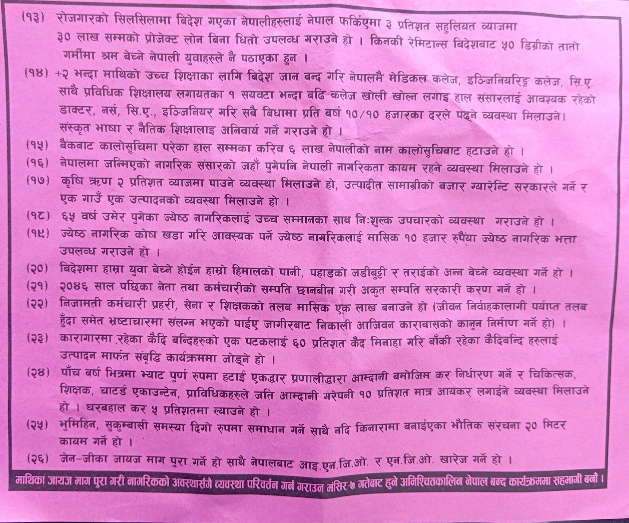 सरकारलाई माग पेस गरेपछि अभियान सदस्यले सरकारसमक्ष पेस गरेका माग पढेर सुनाएका छन् । ‘नेपाल नेपालीले नै बनाउने हो, नेपालमै व्यापार गर्न पाउने व्यवस्था मिलाउनुपर्ने, हिन्दु राज्य स्थापनाका लागि जनमत सङ्ग्रह गरिनुपर्ने’, सरकारसमक्ष पेस गरेका मागमा भनिएको छ, ‘प्रदेश संरचना खारेज गरी पाँच विकास क्षेत्र र १४ अञ्चलको व्यवस्था गर्नुपर्ने । ’