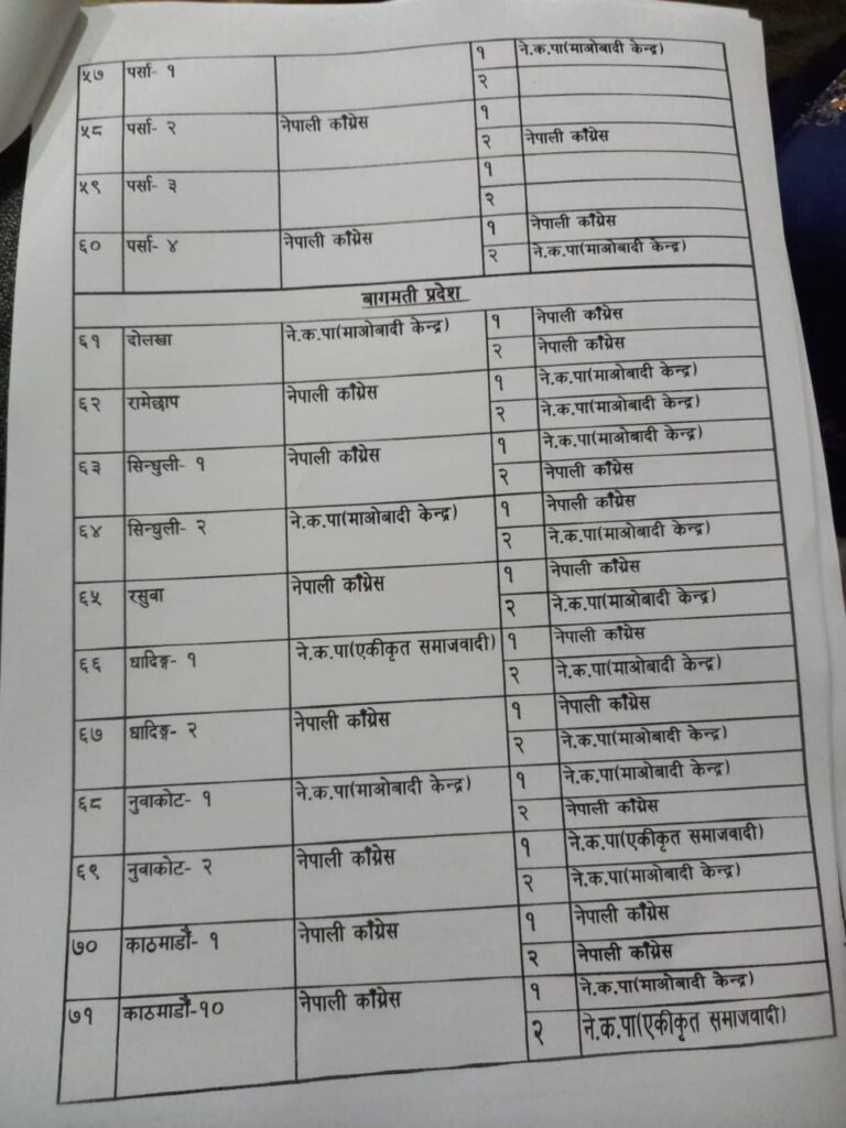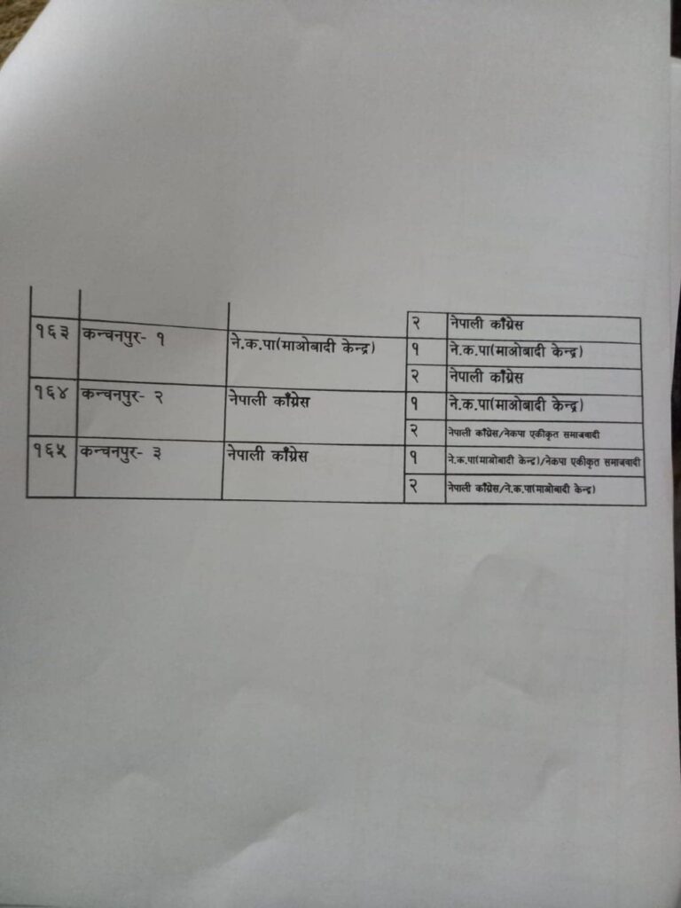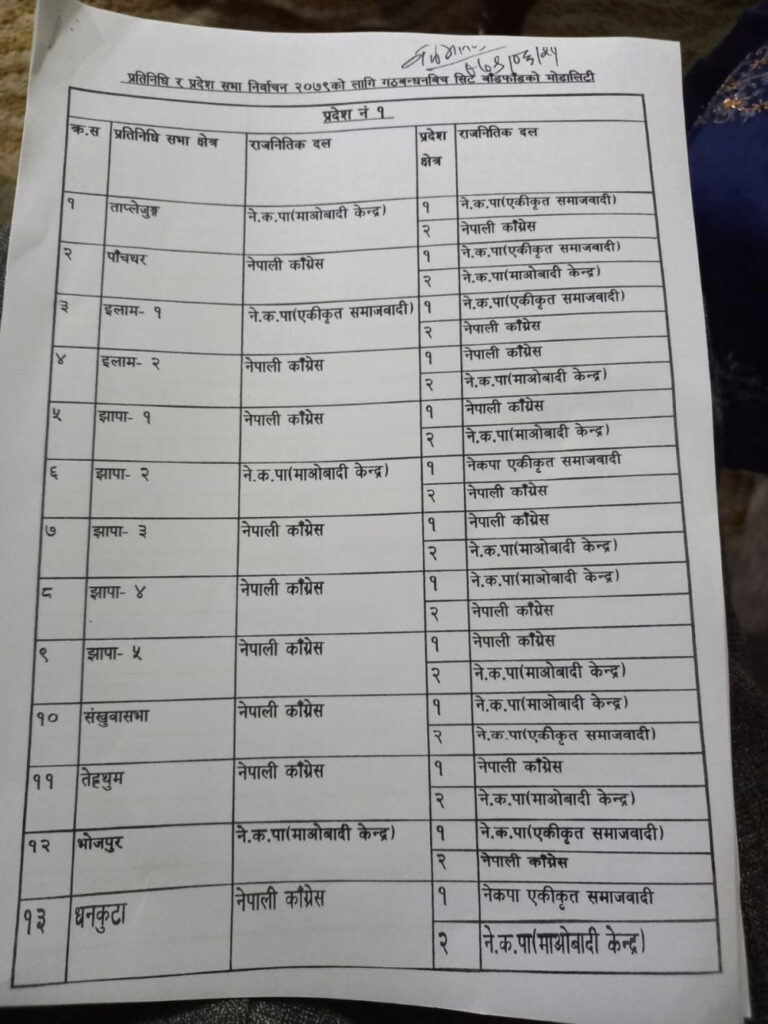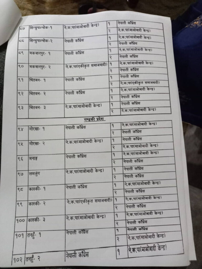 नेपाली कांग्रेस, नेकपा माओवादी केन्द्र, नेकपा एकीकृत समाजवादी र राष्ट्रिय जनमोर्चाबीच सिट बाडफाँटको भागबन्डा टुंगिएको हो ।