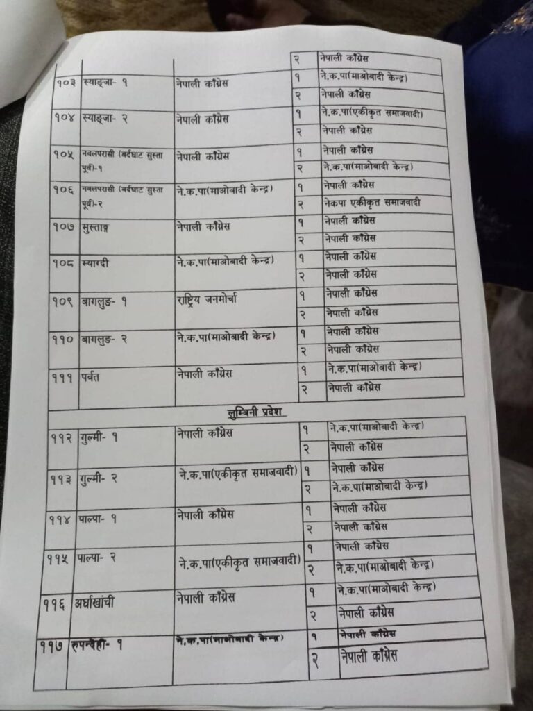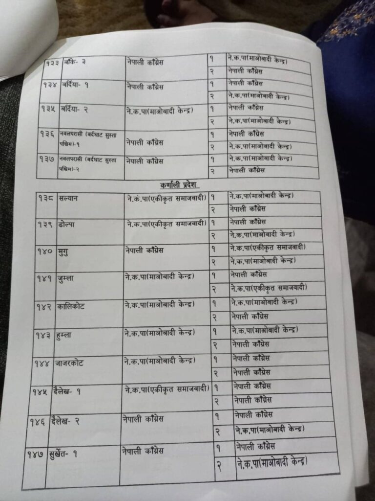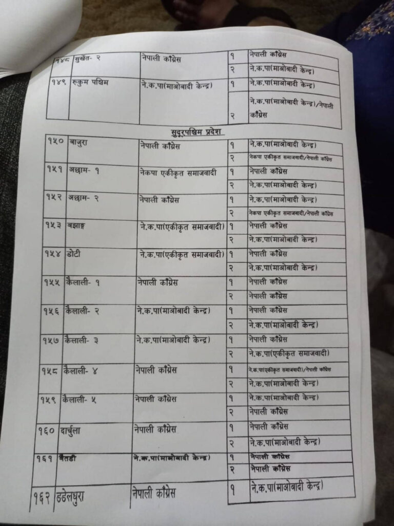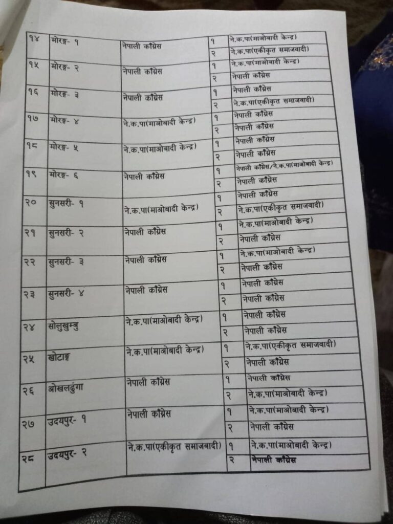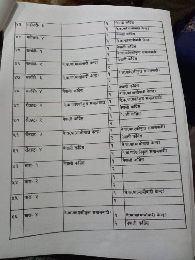 नेपाली कांग्रेस, नेकपा माओवादी केन्द्र, नेकपा एकीकृत समाजवादी र राष्ट्रिय जनमोर्चाबीच सिट बाडफाँटको भागबन्डा टुंगिएको हो ।