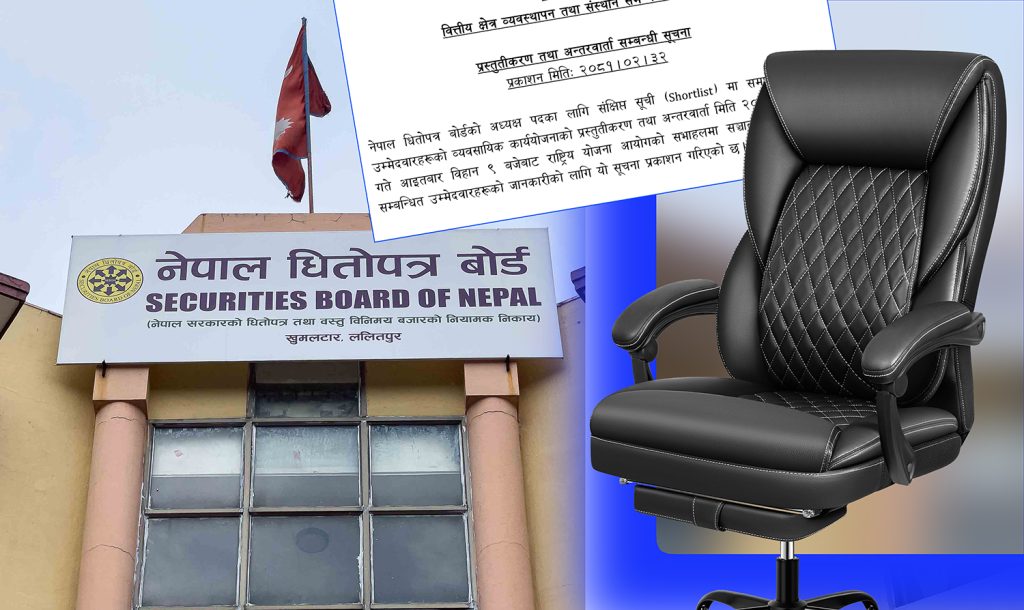 काठमाडौं । नेपाल धितोपत्र बोर्ड (सेबोन)को अध्यक्षका लागि शर्टलिस्टमा परेका उम्मेदवारहरूको कार्ययोजना प्रस्तुतिकरण र अन्तर्वार्ता भोलि आइतबार हुने भएको छ ।अर्थ मन्त्रालयको वित्तीय क्षेत्र व्यवस्थापन तथा संस्थान समन्वय महाशाखाले हिजो शुक्रबार एक सूचना जारी गर्दै भोलि आइतबार कार्ययोजना प्रस्तुतिकरण र अन्तर्वार्ताका लागि बोलाएको हो ।कार्ययोजना प्रस्तुति र अन्तर्वार्ता भोलि बिहान ९ बजेदेखि राष्ट्रिय योजना आयोगको … Continue reading सेबोनको अध्यक्षका लागि शर्टलिस्टमा परेकाहरूको कार्ययोजना प्रस्तुतिकरण र अन्तर्वार्ता भोलि हुने