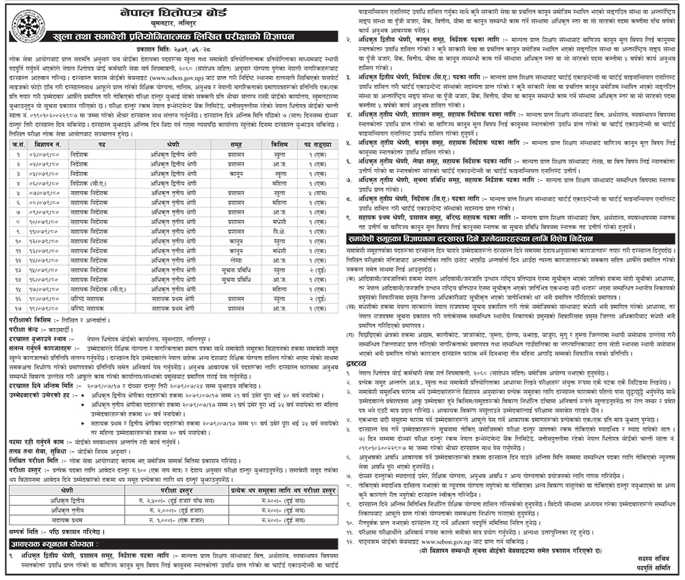 विभिन्न पदमा दरखास्त खुलाइएको छ । सेबोनले एक सूचना जारी गर्दै खुला तथा समावेशी प्रतियोगितात्मक लिखित परीक्षामार्फत दरखास्त खुलाएको हो ।