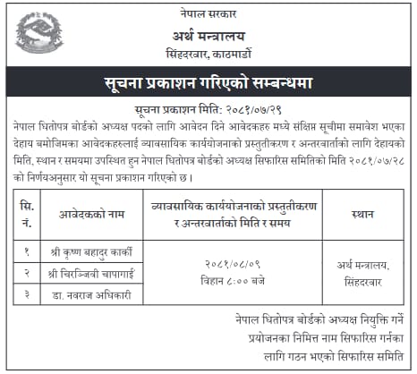 समितिले सूचना जारी गर्दै कृष्ण बहादुर कार्की, चिरञ्जीवी चापागाईँ र डा. नवराज अधिकारीलाई बोलाएको छ । तीन जनाको अन्तवार्ता आज ८ बजे सिंहदरबारको अर्थ मन्त्रालयमा हुनेछ । यसअघि सन्तोषनारायण श्रेष्ठ र धितोपत्र बोर्डका कार्यकारी निर्देशक मुक्ति श्रेष्ठको अन्तरवार्ता सकिएको छ । धितोपत्र बोर्डमा २०८० पुस २० गतेदेखि अध्यक्ष बिहीन छ ।