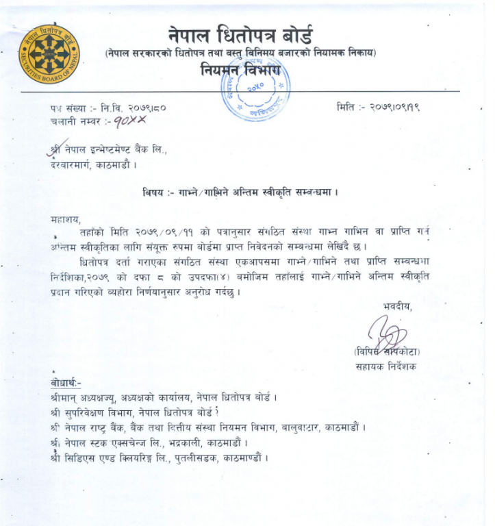 बोर्डले पुस ११ गतेको पत्र अनुसार संगठित संस्था गाभ्नरगाभिन वा प्राप्ति गर्न अन्तिम स्वीकृतिका लागि संयुक्त रुपमा बोर्डमा पत्र आएपछि अन्तिम स्वीकृती दिएको जनाएको छ ।