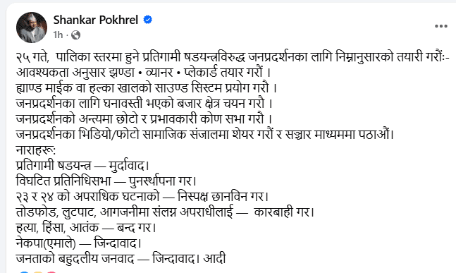 महासचिव पोखरेलले सामाजिक सञ्जालमार्फत कार्यकर्ताहरूलाई जनपरिचालनमा सहभागी हुने सङ्ख्याका आधारमा आवश्यकता आधारमा पार्टीको झन्डा, व्यानर र प्लेकार्ड तयार गर्न निर्देशन दिएका हुन् ।