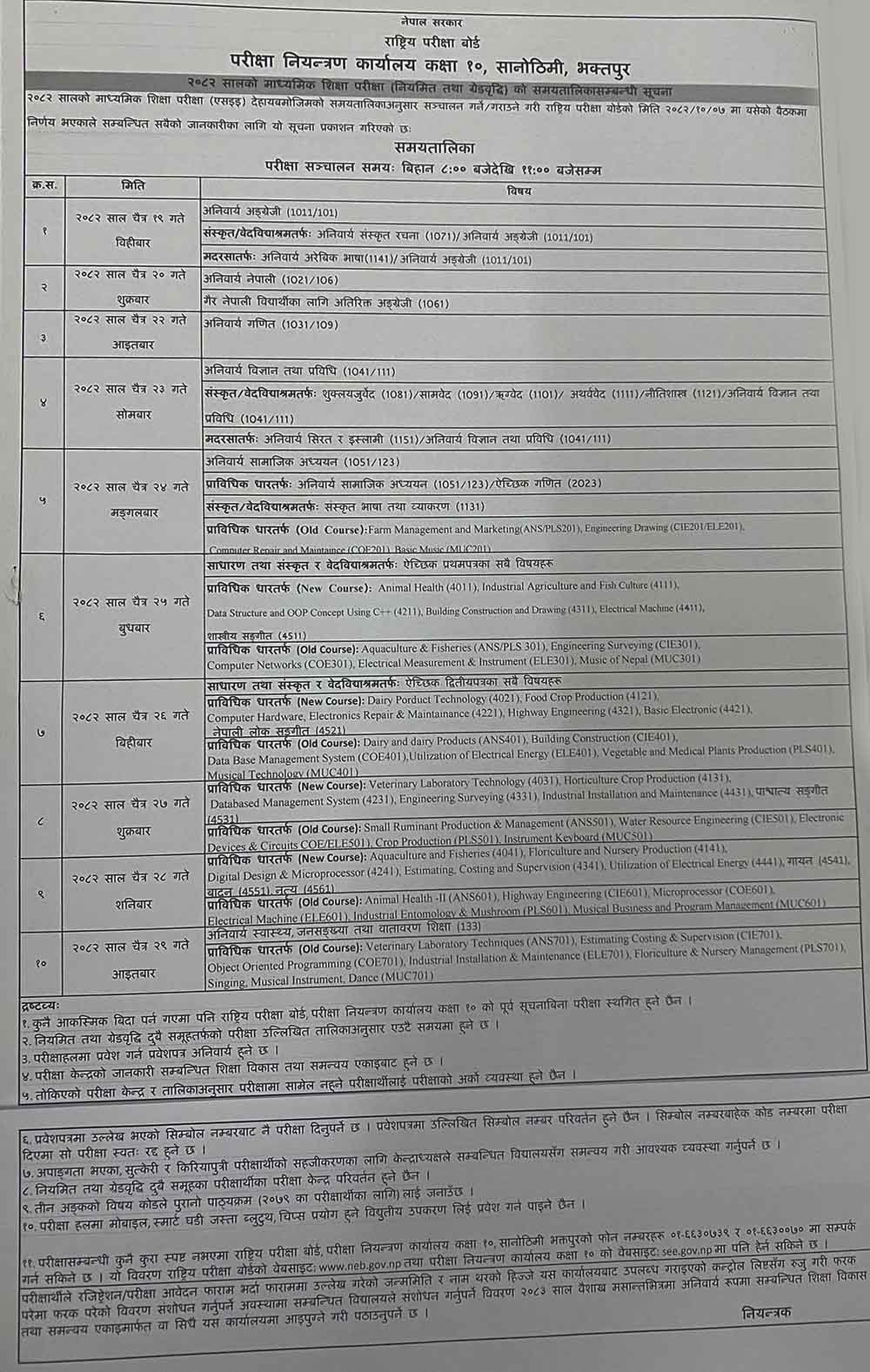 २०८२ सालको एसईई परीक्षा चैत्र १९ गते बिहीबारबाट सुरु हुने तालिका सार्बजनिक भएको छ ।