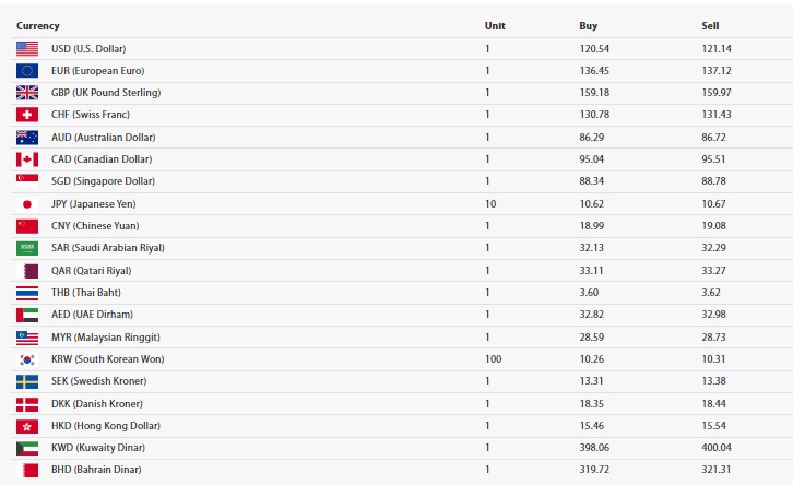 काठमाडौं । नेपाल राष्ट्र बैंकले शुक्रबारको लागि विदेशी मुद्राको विनिमय दर सार्वजनिक गरेको छ । राष्ट्र बैंकले अमेरिकी डलर एकको खरिद दर अधिकतम १२० रुपैयाँ ५४ पैसा र बिक्री दर १२१ रुपैयाँ १४ पैसा कायम गरेको छ ।