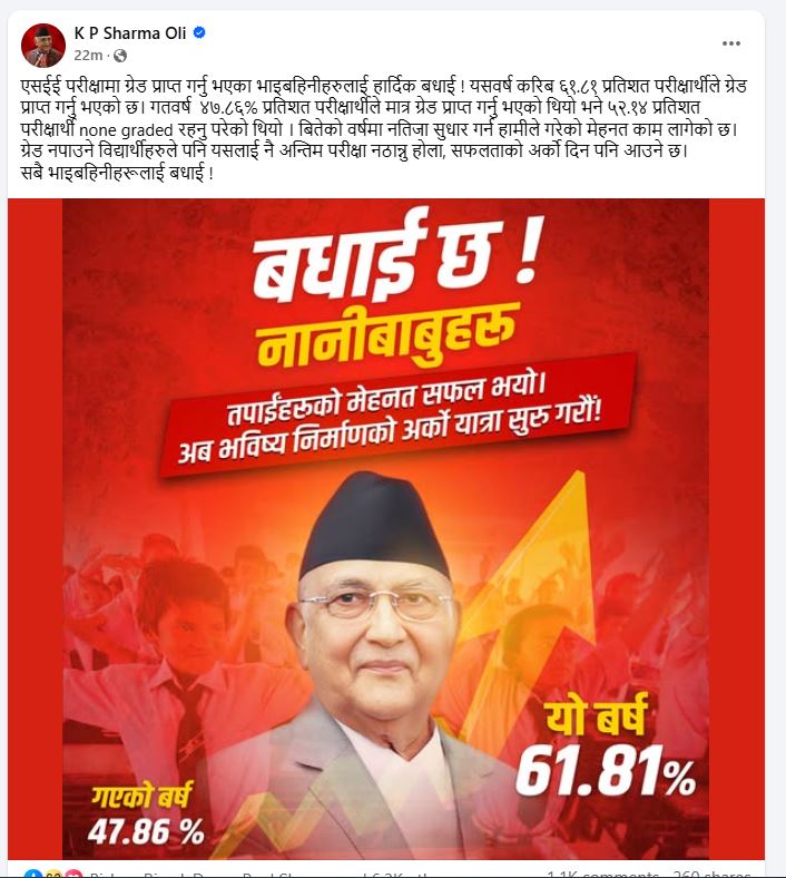 सामाजिक सञ्जालमा लेख्दै प्रधानमन्त्री ओलीले यसवर्ष करिब ६१.८१ प्रतिशत परीक्षार्थीले ग्रेड प्राप्त गरेको उल्लेख गर्दै गत वर्ष ४७.८६ प्रतिशत परीक्षार्थीले मात्र ग्रेड प्राप्त गरेकोमा यस वर्ष नतिजामा सुधार आएको उल्लेख गरेका छन् ।