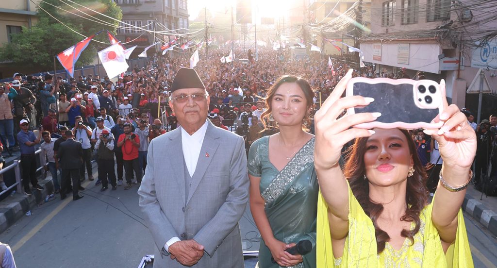 नेकपा (एमाले) ले आज बिहीबार लोकतन्त्र दिवसको अवसरमा काठमाडौंको भृकुटीमण्डपमा आयोजना गरेको ‘युथ सेलिब्रेशन’ मा प्रधानमन्त्री एवम् एमालेका अध्यक्ष केपी शर्मा ओलीसँग सेल्फी खिच्दै कार्यक्रमका सञ्चालिकाद्वय बिहानी पङ्गेनी र रोनिशा श्रेष्ठ । पृष्ठभूमिमा कार्यक्रममा सहभागी हजारौँ युवा । तस्बिर : प्रधानमन्त्रीको सचिवालय