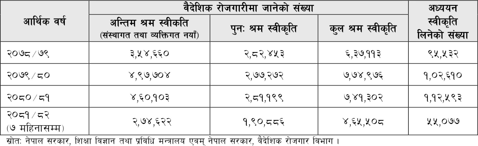 आर्थिक वर्ष २०८१/०८२ को ६ महिनासम्म वैदेशिक रोजगारीको खोजी गर्दै चार लाख ५६ हजार ५०८ जना र अध्ययनका लागि ५५ हजार ७७ जना विदेसिएका छन् । त्यसमध्ये संस्थागत तथा व्यक्तिगत रूपमा अन्तिम श्रम स्वीकृति लिनेको सङ्ख्या दुई लाख ७४ हजार ६२२ जना र पुनः श्रम स्वीकृति लिनेको सङ्ख्या एक लाख ९० हजार ८८६ जना छन् ।