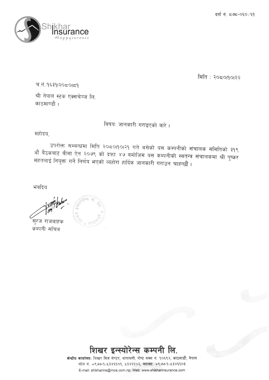 काठमाडौं । शिखर इन्स्योरेन्स कम्पनीको स्वतन्त्र संचालकमा पुष्कर महत नियुक्त भएका छन् ।
