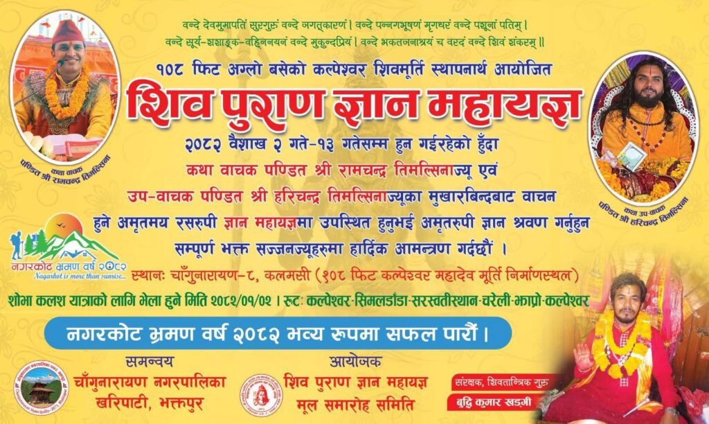 नगरकोट भ्रमण वर्ष–२०८२ लाई समेत सफल बनाउन धार्मिक पर्यटन प्रवद्र्धन गर्ने लक्ष्यका साथै कल्पेश्वर महादेवको मूर्ति निर्माणलाई पूर्णता दिन मन्दिर परिसरमै शिव पुराण महायज्ञको आयोजना गर्न लागेको हो ।