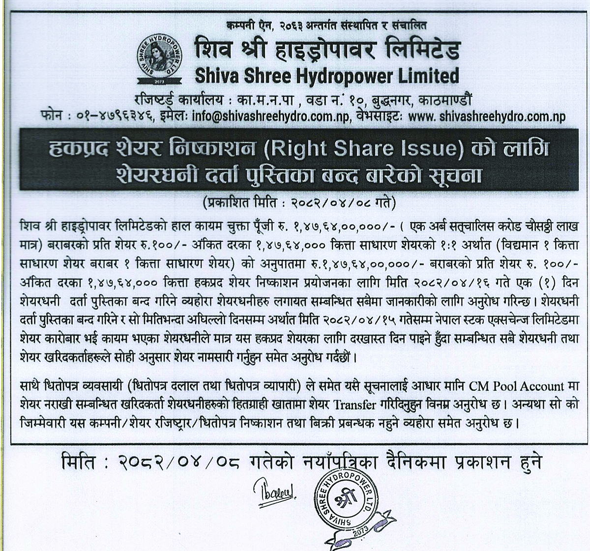 काठमाडौं । शिवश्री हाइड्रोपावर लिमिटेडले आफ्नो कायम चुक्ता पुँजीको १:१ अनुपातमा हकप्रद शेयर जारी गर्ने भएको छ ।