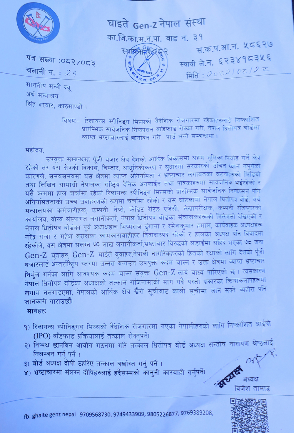 उनीहरूले रिलायन्स स्पिनिङ मिल्सको वैदेशिक रोजगारीमा गएकालाई निष्कासन गरेको आईपीओ बाँडफाँड रोक्का गरी नेपाल धितोपत्र बोर्डमा भएको भ्रष्टाचार छानबिन गर्ने मागसहित अर्थमन्त्री खनाललाई भेट्न जान चाहेका थिए । तर, बिहान ९ बजेदेखि सिंहदरबार प्रवेश गर्ने पास नपाएपछि उनीहरूले पश्चिम गेटमा धर्ना थालेका हुन् ।