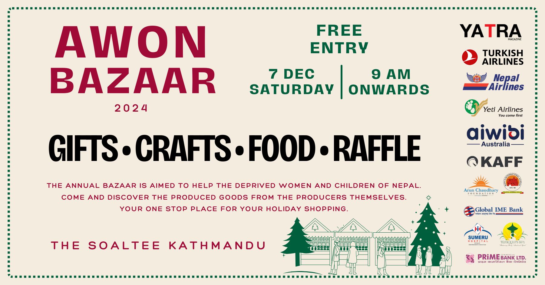 काठमाडाैं । शनिबार सोल्टी होटल काठमाडौंमा एवन बजार आयोजना हुने भएको छ । एक्टिभ उमन अफ नेपाल (एवन) ले विगत चार दशक यता संचालन गर्दै आएको एवन बजारको २०२४ संस्करण आउने शनिवार डिसेम्बर ७ मा आयोजना हुने भएको हो । जसको अमेरिकी राजदुत डिन आर थम्पसनले विहान ११ बजे उद्धाटन गर्नेछन् भने यस कार्यक्रममा नेपालमा रहेका विभिन्न देशका राजदुत तथा कुटनितीज्ञहरुले सहभागिता जनाउनेछन् ।
