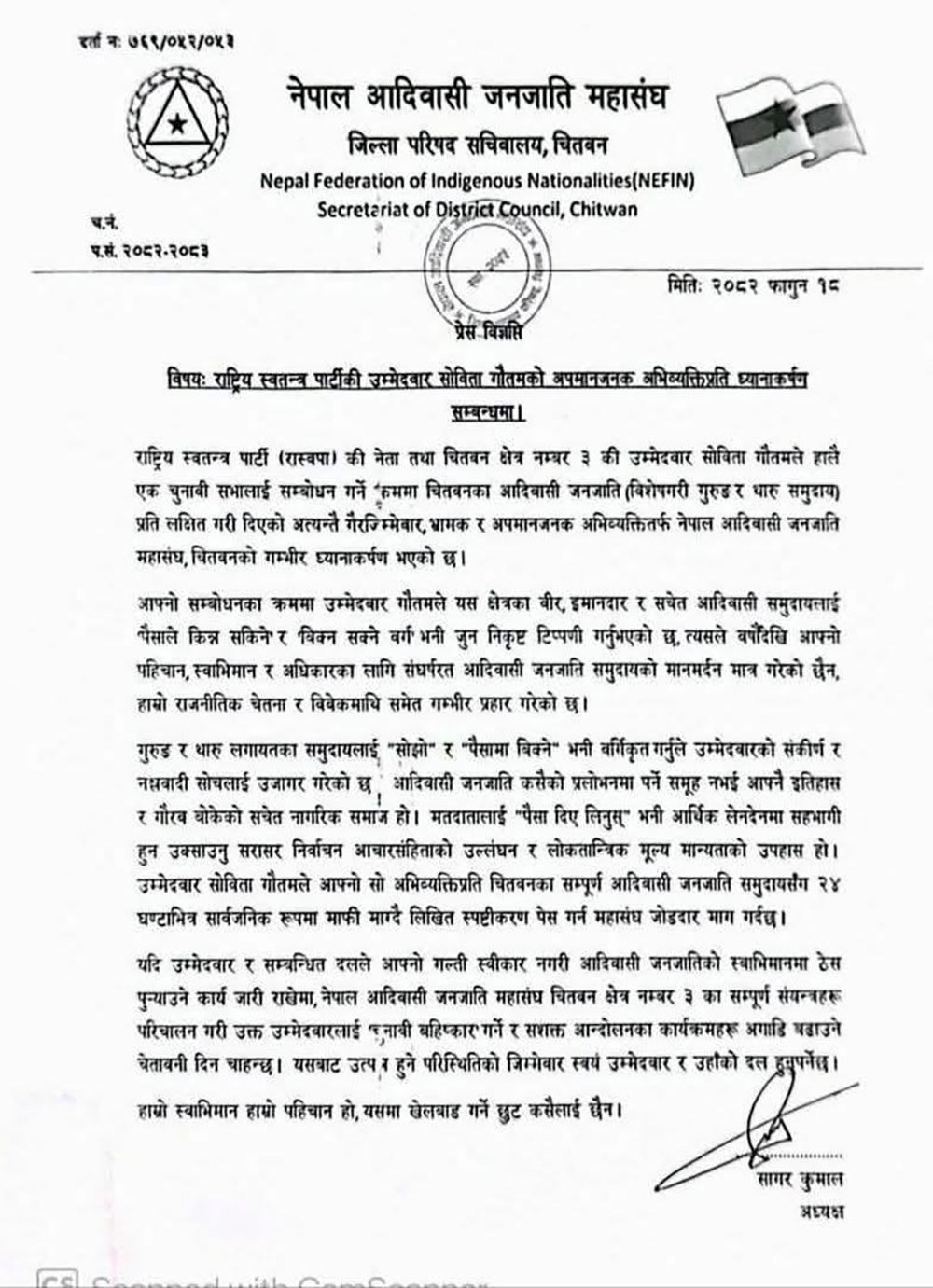 सोविताले चुनावी सम्बोधनका क्रममा आदिवासी जनजाति पैसामा बिक्ने भन्दै अभिव्यक्ति दिएपछि उनको सो अभिव्यक्तिप्रति आपत्ति जनाइएको छ । उनले चितवनमा आफ्नो सम्बोधनका क्रममा वीर, इमानदार र सचेत आदिवासी समुदायलाई ‘पैसाले किन्न सकिने’ र ‘बिक्न सक्ने वर्ग’ भन्दै टिप्पणी गरेकी थिइन् । महासंघको चितवन परिषदले गौतमलाई आफ्नो अभिव्यक्तिप्रति माफिउ माग्न आग्रह गर्दै कडा प्रतिवाद गर्ने चेतावनी दिएको छ ।