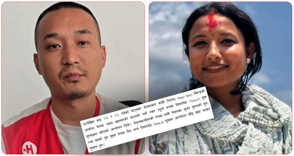 काठमाडौं । भ्रष्टाचार, कुशासन र अनियमितताविरुद्ध भदौ २३ र २४ गते भएको जेन–जी आन्दोलनको नेतृत्वकर्ताहरू सुधन गुरुङ र रक्षा बम भएको खुलेको छ ।हालै बाहिरिएको गौरीबहादुर कार्की आयोगको प्रतिवेदन अनुसार भदौ २३ र २४ गतेको घटनाका योजनाकार कोही नभए पनि आन्दोलनको नेतृत्वकर्ता हामी नेपालका सुधन गुरुङ र रक्षा बम रहेको खुलासा भएको हो ।उक्त आन्दोलनमा … Continue reading ‘जेन–जी आन्दोलनका नेतृत्वकर्ता सुधन गुरुङ र रक्षा बम हुन्’