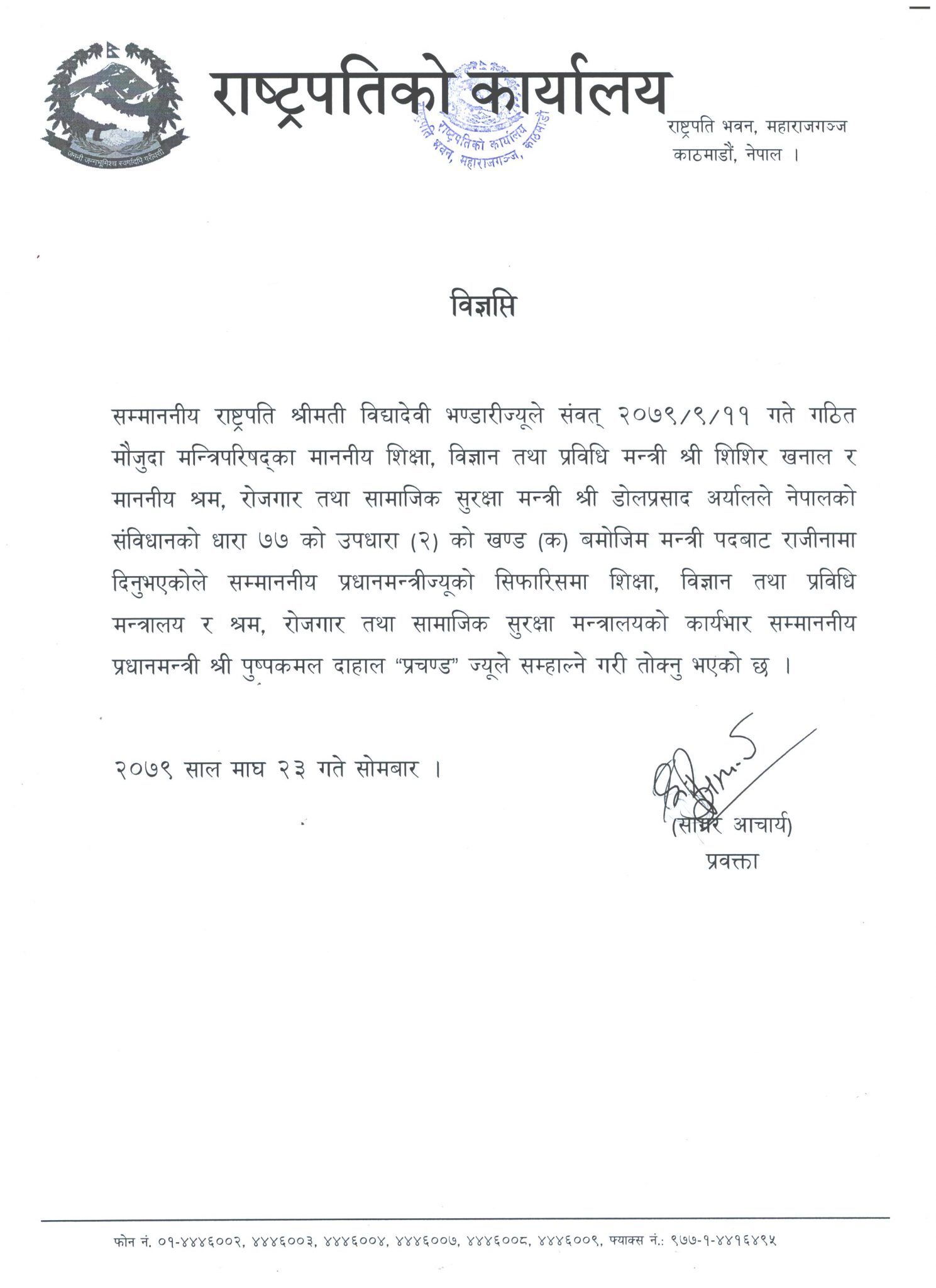 श्रम, रोजगार तथा सामाजिक सुरक्षामन्त्री डोलप्रसाद अर्याल, शिक्षा, विज्ञान तथा प्रविधिमन्त्री शिशिर खनाल र स्वास्थ्य तथा जनसंख्या राज्यमन्त्री तोसिमा कार्कीको राजीनामा स्वीकृत गरिएको हो । राष्ट्रपति कार्यालयद्वारा जारी विज्ञप्तिअनुसार राजीनामापछि रिक्त शिक्षा र श्रम मन्त्रालयको कार्यभार प्रधानमन्त्री पुष्पकमल दाहाल ‘प्रचण्ड’ लाई तोकिएको छ।