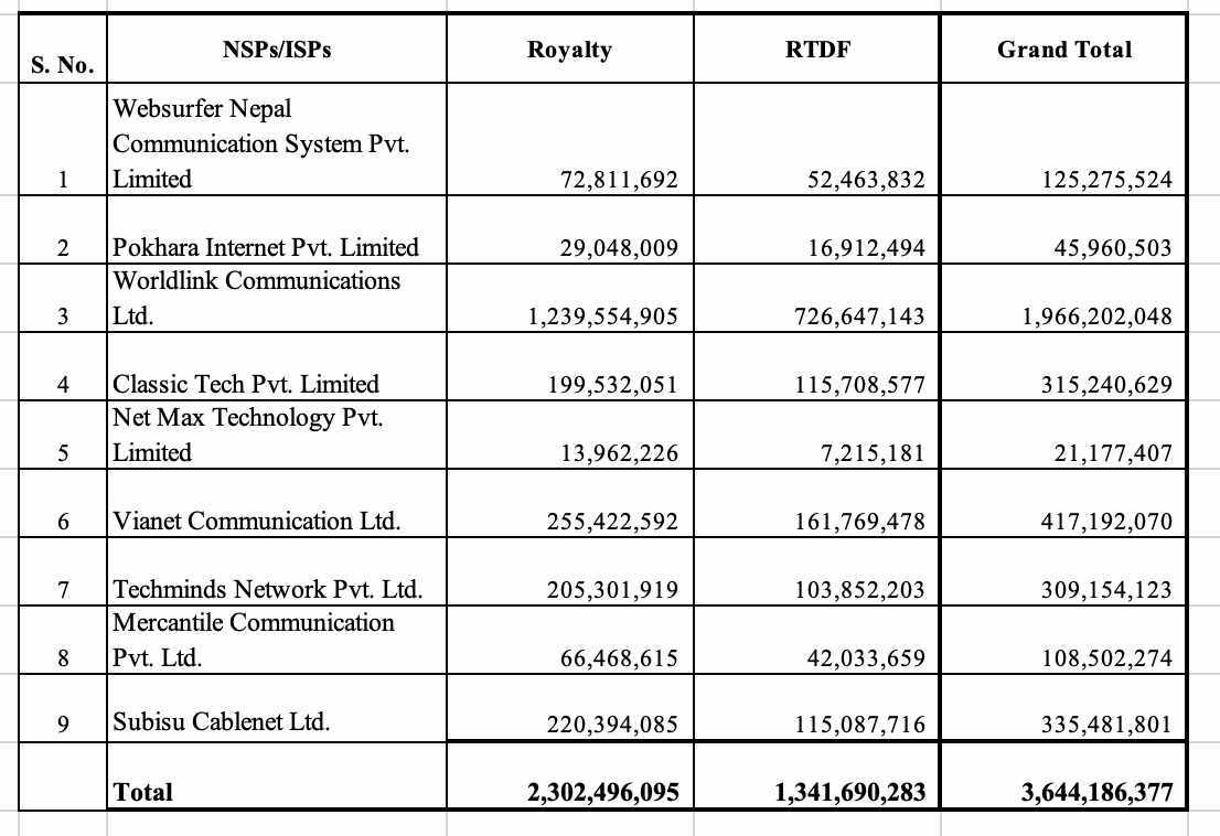 नेपाल दूरसञ्चार प्राधिकरण स्रोतका अनुसार नौ वटा इन्टरनेट सेवा प्रदायकबाट रोयल्टी राजश्व तथा ग्रामीण दूरसञ्चार विकास शुल्क वापत कूल तीन अर्ब ६४ करोड रकम असुल गर्न बाँकी रहेको छ । जसअनुसार वल्र्डलिङ्क कम्युनिकेसनले १ अर्ब ९६ करोडभन्दा बढी तिर्न बाँकी छ । त्यसैगरी भायानेट कम्युनिकेसनबाट ४१ करोड भन्दा बढी, सुविसुबाट ३३ करोडभन्दा बढी, क्लासिक टेकबाट ३१ करोडभन्दा बढी, टेकमाइण्डबाट ३० करोड भन्दा बढी, वेफसर्फरबाट १२ करोडभन्दा बढी, मर्कन्टायलबाट १० करोडभन्दा बढी, पोखरा इन्टरनेटबाट ४ अर्बभन्दा बढी र नेटम्याक्सबाट २ करोडभन्दा बढी रकम असुल गर्न बाँकी रहेको छ ।