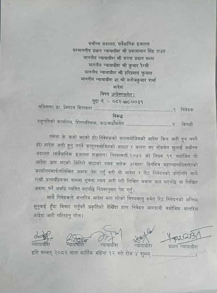 सर्वोच्च अदालतले विपक्षीहरूलाई सात दिनभित्र महान्यायाधीवक्ताको कार्यालयमार्फत लिखिज जबाफको समेत माग गरेको छ ।
