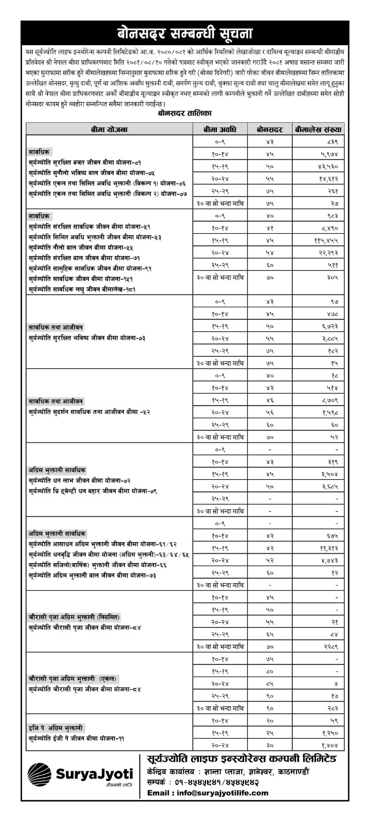 प्रधिकरणबाट जारी रिक्स बेस्ड क्यापिटल निर्देशिकालाई पालना गर्दै सूर्यज्योति लाइफ इन्स्योरेन्स कम्पनी आरबिसी भ्यालुएसन स्वीकृत गर्ने पहिलो जीबन बीमा कम्पनी बनेको छ । कम्पनीले आफ्ना बीमालेखहरुमा दिइने बोनस दर सार्वजनिक गरेको छ ।