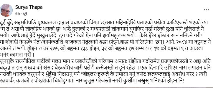थापाले प्रचण्डलाई समेत कटाक्ष गर्दै दुई बुँदे सहमतिपछि छ-सात महिनादेखि पलाएको पखेटा काटिएजस्तै भएको टिप्पणी गरेका छन् ।