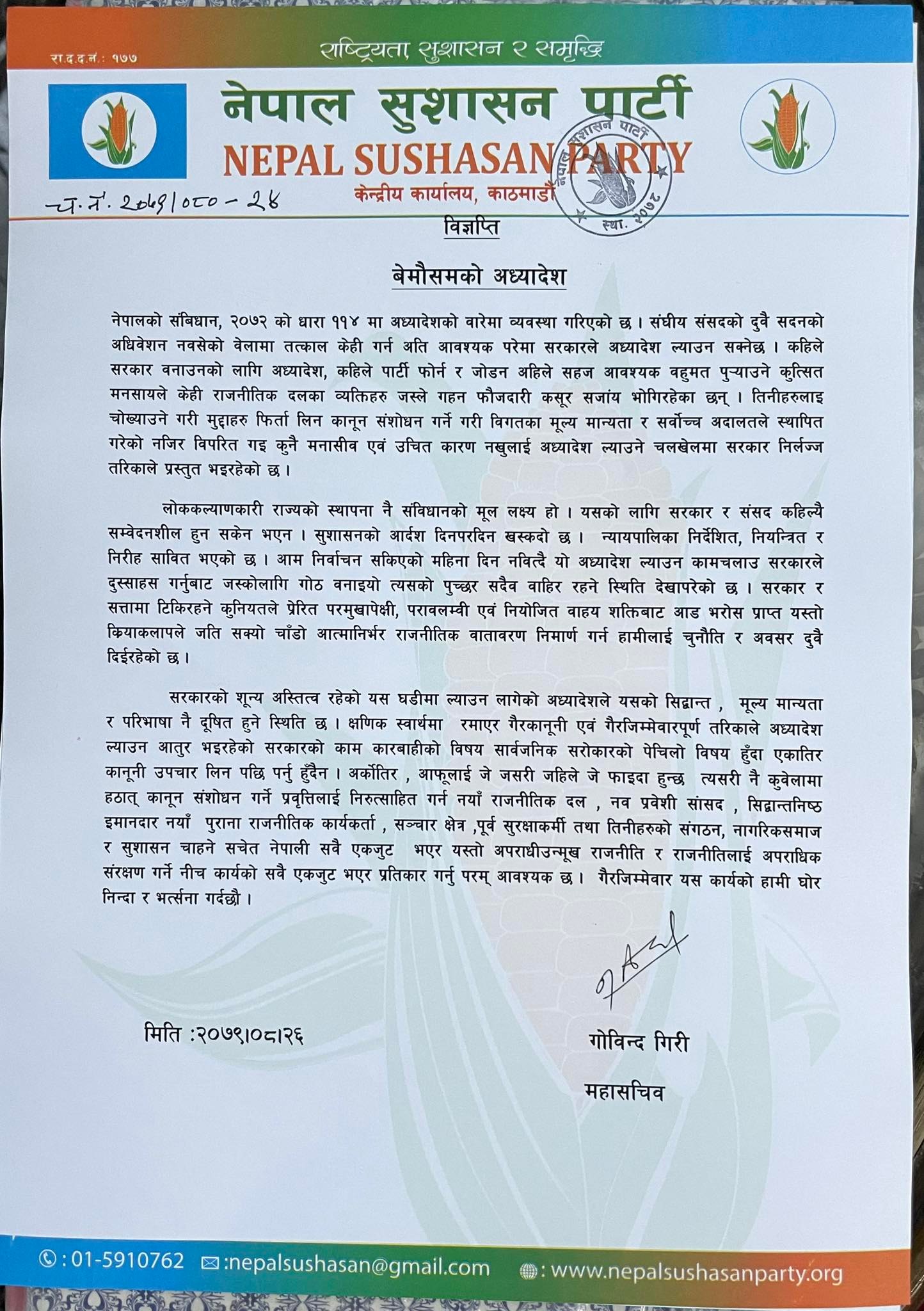 ‘नेपालको संबिधान, २०७२ को धारा ११४ मा अध्यादेशको वारेमा व्यवस्था गरिएको छ । संघीय संसदको दुवै सदनको अधिवेशन नवसेको वेलामा तत्काल केही गर्न अति आवश्यक परेमा सरकारले अध्यादेश ल्याउन सक्नेछ । कहिले सरकार वनाउनको लागि अध्यादेश, कहिले पार्टी फोर्न र जोडन अहिले सहज आवश्यक बहुमत पुऱ्याउने कुत्सित मनसायले केही राजनीतिक दलका व्यक्तिहरु जस्ले गहन फौजदारी कसूर सजाय भोगिरहेका छन् । तिनीहरुलाइ चोख्याउने गरी मुद्दाहरु फिर्ता लिन कानून संशोधन गर्ने गरी विगतका मूल्य मान्यता र सर्वोच्च अदालतले स्थापित गरेको नजिर विपरित गइ कुनै मनासीव एवं उचित कारण नखुलाई अध्यादेश ल्याउने चलखेलमा सरकार निर्लज्ज तरिकाले प्रस्तुत भइरहेको छ ।’ विज्ञप्तीमा भनिएकाे छ ।