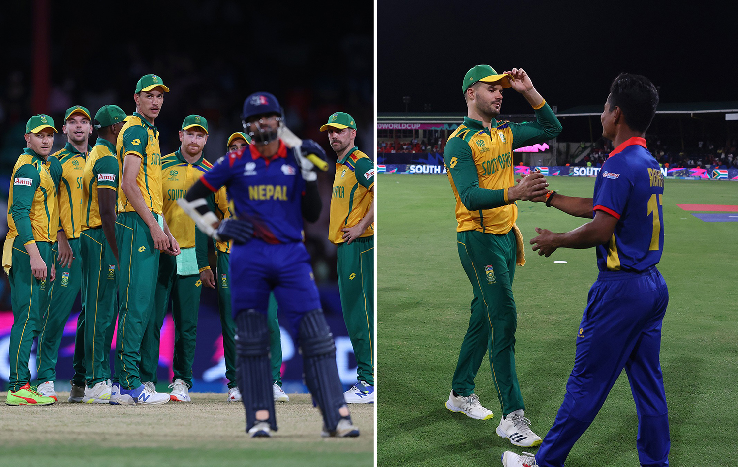 वेस्टइन्डिजको सेन्ट भिसेन्टस्थित आर्नोस भले ग्राण्ड किङ्ग्सटाउन रङ्गशालामा भएको खेलमा दक्षिण अफ्रिकाका टाबरेज साम्सीले एकै ओभरमा दुई महत्वपूर्ण विकेट लिएपछि नेपाल दबाबमा पुगेको थियो ।