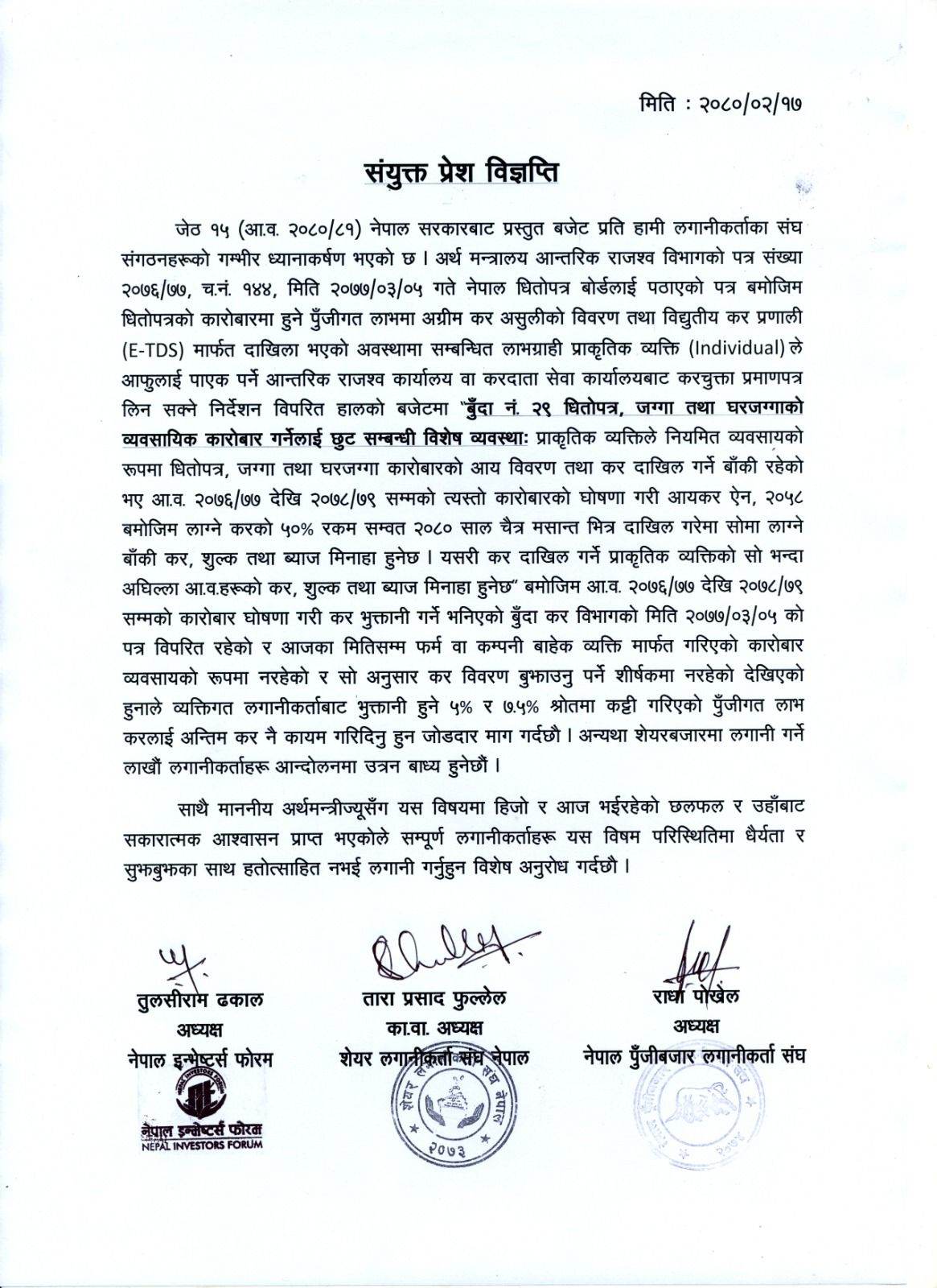अन्यथा सेयर बजारमा लगानी गर्ने लाखौं लगानीकर्ताहरु आन्दोलनमा उत्रन बाध्य हुने पनि लगानीकर्ताका संगठनहरुले चेतावनी दिएका छन् । लगानीकर्ताहरुले आर्थिक विधेयक २०८० को बुँदा नम्बर २९ मा भएको ‘धितोपत्र, जग्गा तथा घरजग्गाको व्यवसायिक कारोबार गर्नेलाई छुट सम्बन्धी विशेष व्यवस्था’ कर विभागको २०७७ असार ५ गतेको पत्र विपरीत रहेको पनि बताएका छन् ।