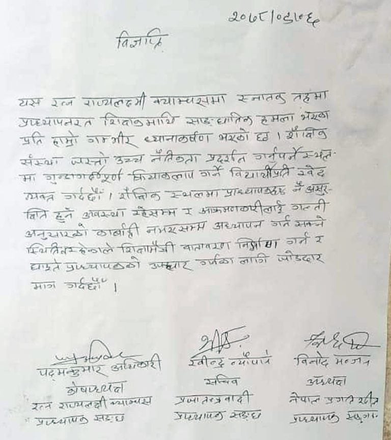काठमाडौं । क्याम्पसको आन्तरिक परीक्षामा चिट चोर्न नदिएपछि रत्नराज्यलक्ष्मी (आरआर) क्याम्पसका शिक्षक कुटिएका छन् ।