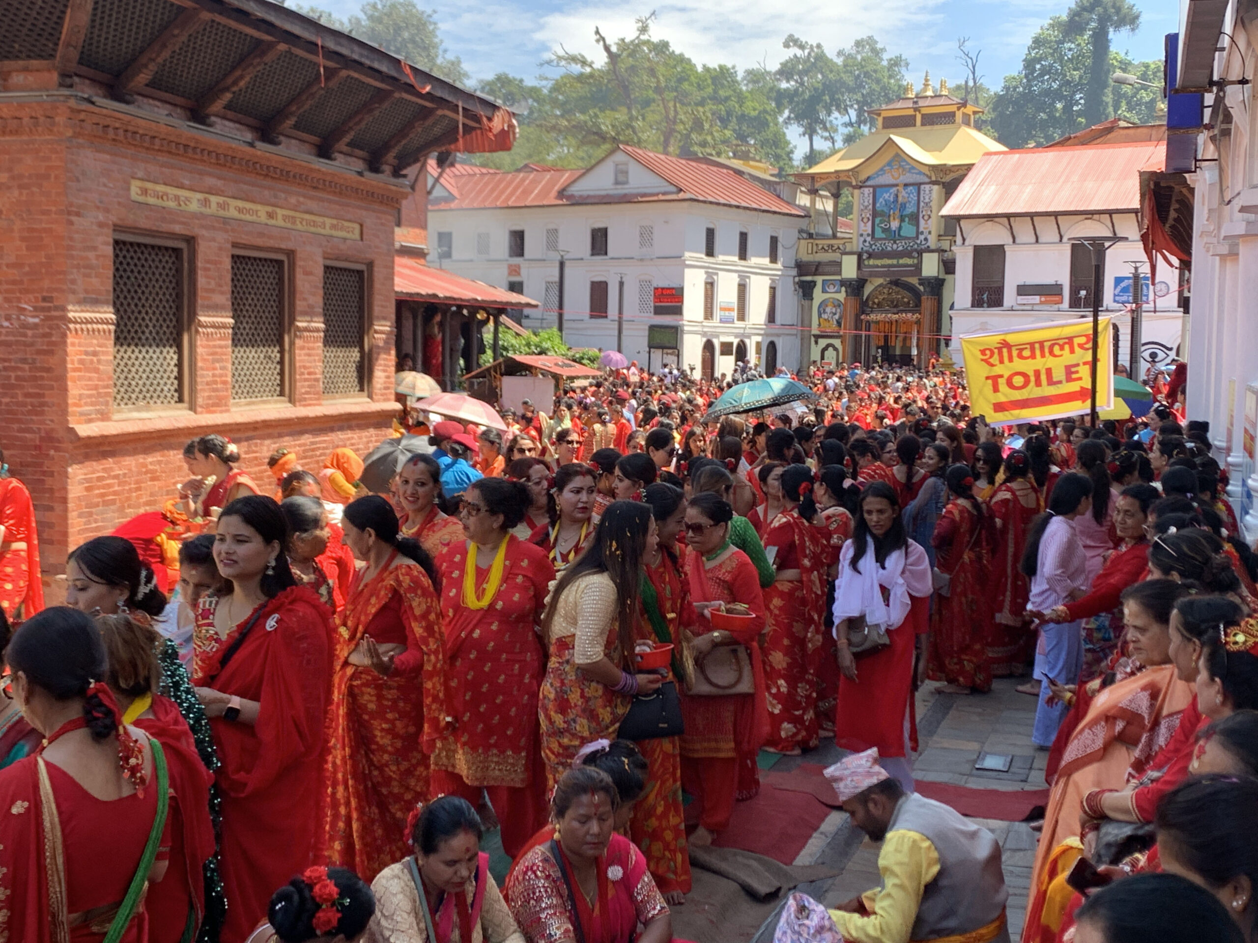 तीजको अवसरमा पशुपति नाथ मन्दिरमा पूजा गर्ने र नाचगान गर्नेहरुको बिहानैदेखि घुइँचो छ । उनीहरु पूजापछि नाचगान गर्दै रमाइरहेका छन् ।